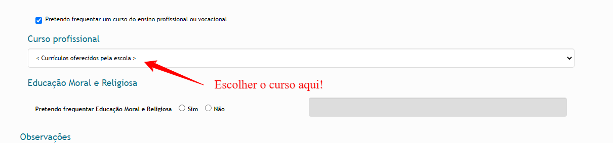 2º Escolher o Curso profissional que deseja inscrever-se:
