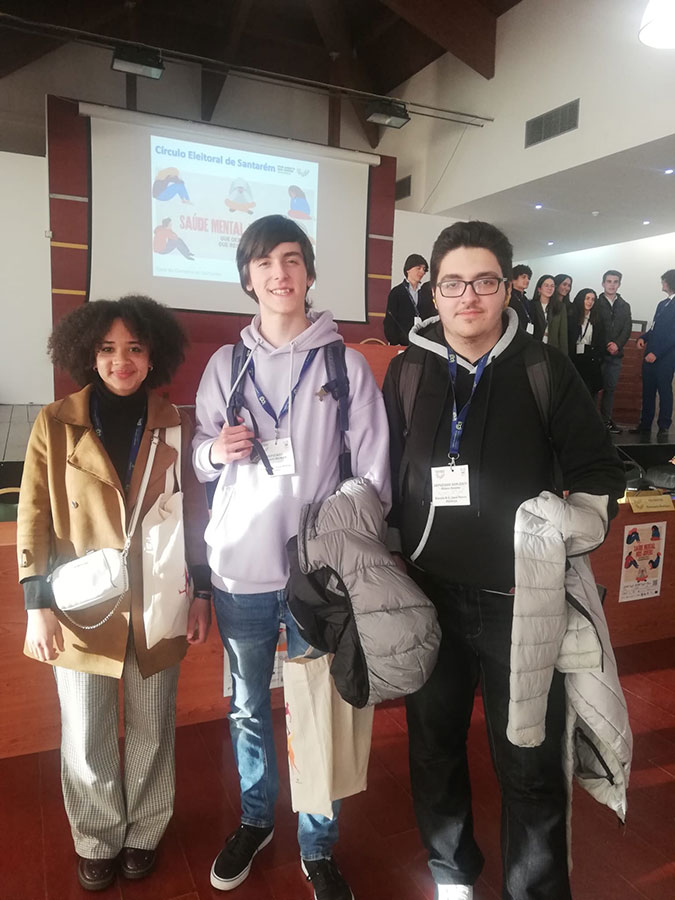 Entre os 54 jovens deputados que fizeram parte desta sessão, provenientes de 18 escolas do distrito, estavam os representantes da Escola EB 2,3/S José Relvas, de Alpiarça. Três jovens promissores que, além de demonstrarem mais uma vez as suas competências argumentativas, encantaram no domínio das relações interpessoais. Falamos do Eduardo Monteiro, da Angelina Mendes e do Rúben Delares, os três deputados que deram voz às medidas apuradas na sessão escolar, para enfrentar o problema a debate este ano, a saúde mental nos jovens: a) dinamização de ações de sensibilização e de informação para a comunidade escolar conducentes à adoção de medidas de prevenção na área da saúde mental; b) criação uma App de diagnóstico de Saúde Mental; c) Psicóloga à distância de um clique: criação de um canal de comunicação anónimo entre alunos e psicólogo(a).